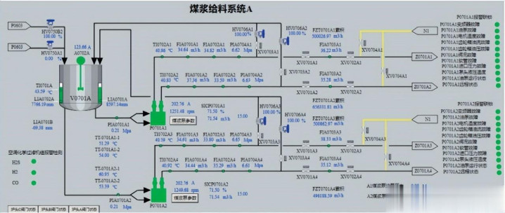 煤浆给料系统A(见图1)精良将煤浆从储存罐运送至反映器。该系统包括多个裂缝组件,如煤浆罐(V0701A)用于储存和羼杂煤浆,液位传感器(LIA0701A)和压力传感器(PIA0701A1)监测罐内参数。进料阀(HV0750B2和HV0750A1)纵容煤浆的插足,煤浆泵(P0701A1和P0701A2)则精良将煤浆运送到不同的反映器。分拨阀(XV0701A1至XV0701A4)和流量传感器(FIA0701A1至FIA0701A4)共同作用,确保煤浆的精准流动和分拨。系统还配备了温度传感器(TI0701A1和TI0702A1)和压力传感器,以实时监测和调治操作条目,确保高效、安全的煤气化过程。流量累计器(FZT0701A1至FZT0701A4)纪录煤浆总流量,情景疏通灯涌现各部分运转情景,通过这些监控和纵容妙技,系统能实时发现并惩办运转中的问题,培植系统的可靠性和安全性。