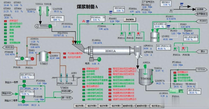 煤浆制备系统A(见图2)精良将煤和水羼杂成煤浆,并将其运送至煤气化反映器。系统包括多个子系统和建立,以确保煤浆的高效制备和运送。主要组件包括用于处理和运送煤的安设(GT0601至GT0606)、储料罐(V0501A和V0501B)、液位传感器(LIA0502A和LIA0502B)、称重安设(W0503A)、羼杂罐(V0605)、羼杂泵(P0603A和P0603B)、进料管说念(A1060A)、加热安设(H0601A)和流量纵容器(FIC0604A)。系统通过各样传感器实时监测系统内的温度、压力、流量和液位,确保操作的安全性和镇定性。煤浆制备系统A通过高效的羼杂泵和加热安设,终结了煤和水的充分羼杂和加热,提高了煤浆的流动性和反映着力。