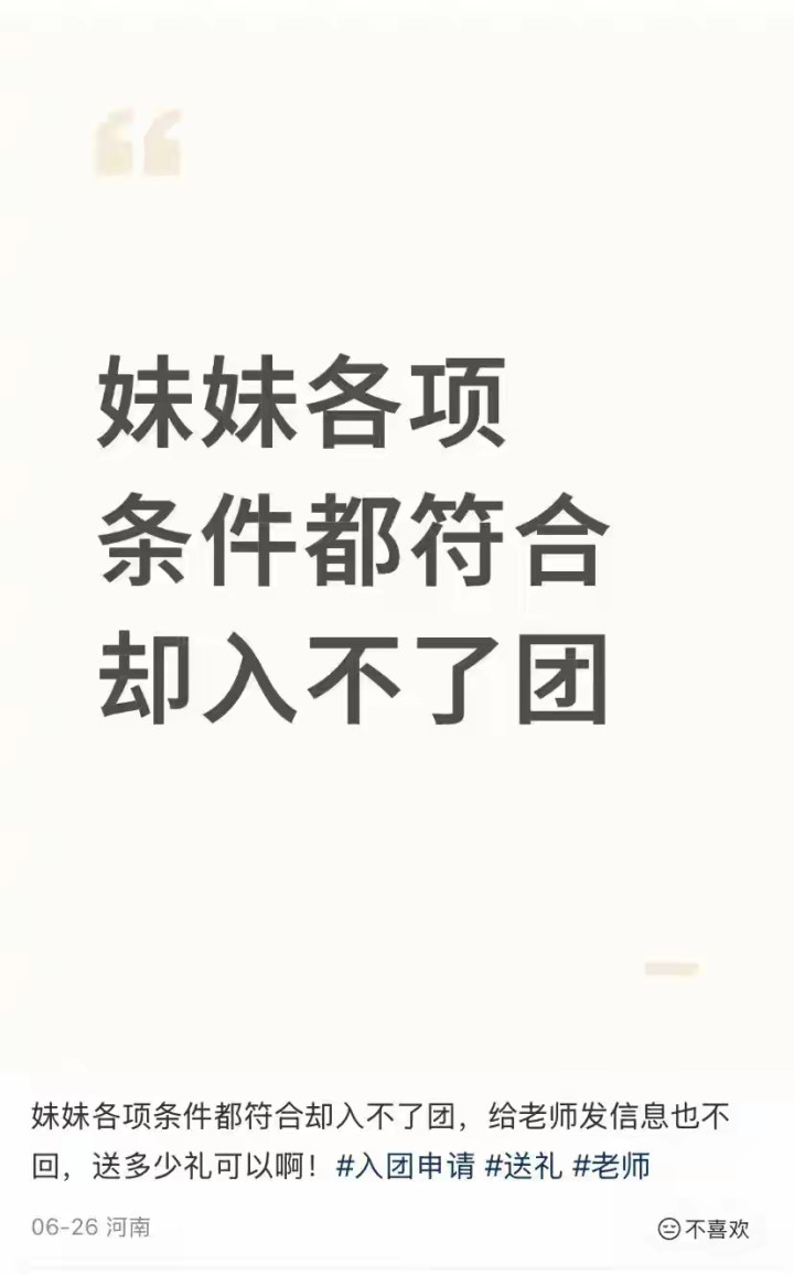 为给孩子改日铺路,不少家长动起歪心想。有初中生家长想给淳厚直立,大学生家长愿给指导员塞钱,就连入团积极分子也纠结是否要“临门一脚”送红包。这些家长深谙“入队-入团-入党-考公”的链路,把入团当成孩子东说念主生竞争的“第一块叩门砖”,却忘了团聚身份本应是优秀后生的荣誉象征。