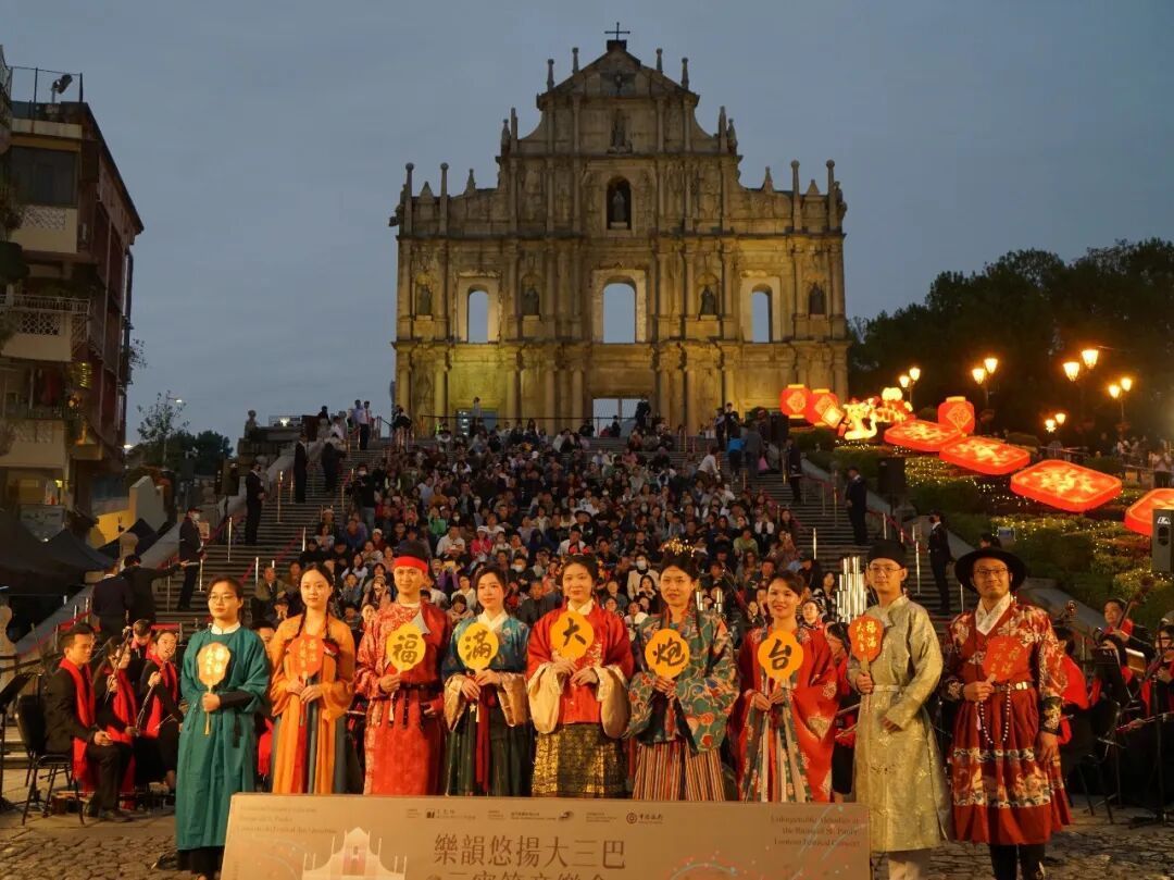 2025年2月12日,澳门中乐团在大三巴牌楼前举行“乐韵漂泊大三巴”元宵节音乐会。图为音乐会中的汉服展示本事。中新社记者 郑嘉伟 摄