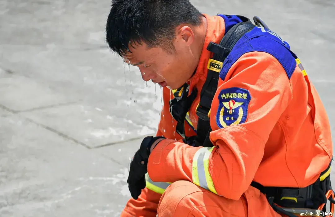 又名消防员本质后蹲踞,汗水垂落,手攥水瓶。烈日下的难熬本质,证明了其责任担当。