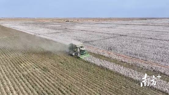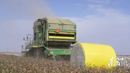 英买里镇英阿瓦提村,大型采棉机正在有序功课。