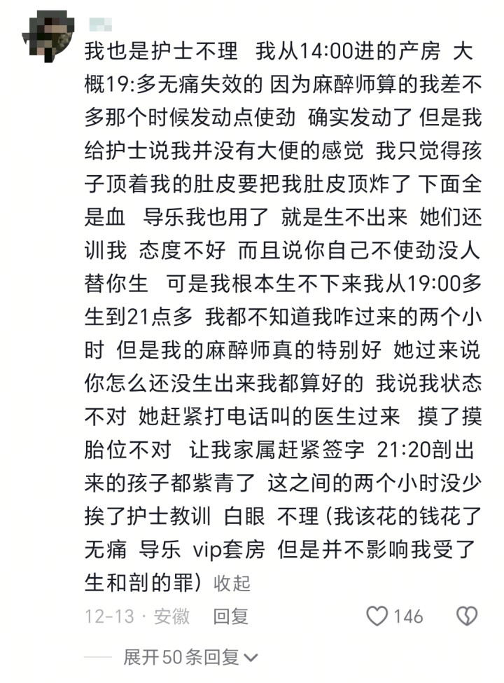一位安徽的宝妈提及我方的阅历,亦然照应不睬不睬,魄力不好还教化她。医师照应一直说,准备生的手艺会有思大便的嗅觉,但她根本莫得,只认为孩子快把肚皮顶裂了,疼得弗成。其后麻醉师发现她气象不合,飞速叫医师,一摸才发现胎位不合,迫切进行了剖腹产。这位宝妈说,该花的钱都花了,无痛、导乐、VIP套房,效果安产和剖腹产的罪透顶受了。