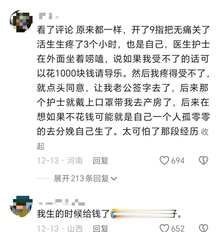 一位河南的宝妈说,我方开了九指后无痛被关了,疼了三个小时,医师和照应在外面坐着聊天。其后告诉她,如果受不了不错花1000块钱请导乐。老公花了这1000块,才有医师照应过来看她。