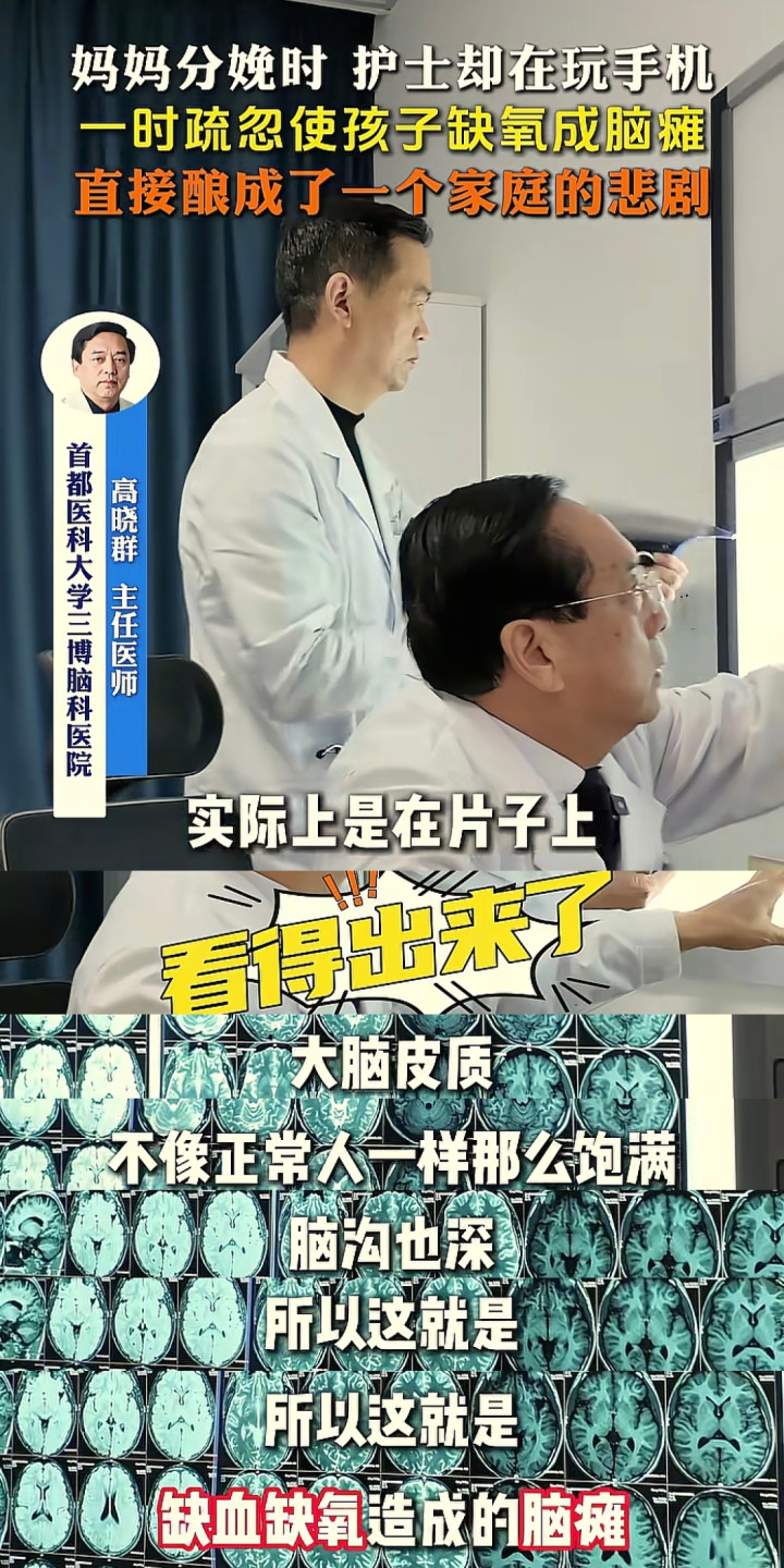高阐述看后发现,孩子的大脑皮质不像平日东说念主那么填塞,脑沟也相比深——这是缺血缺氧形成的脑损害,孩子已有狭窄的脑萎缩,脑外部还有积液。