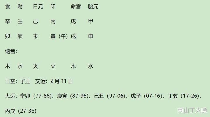 流年辛食生壬财,壬财制丙偏印,甲杀制戊劫;大运戌与时支寅拱午,流年卯合戌,小限戌与时支寅拱午。